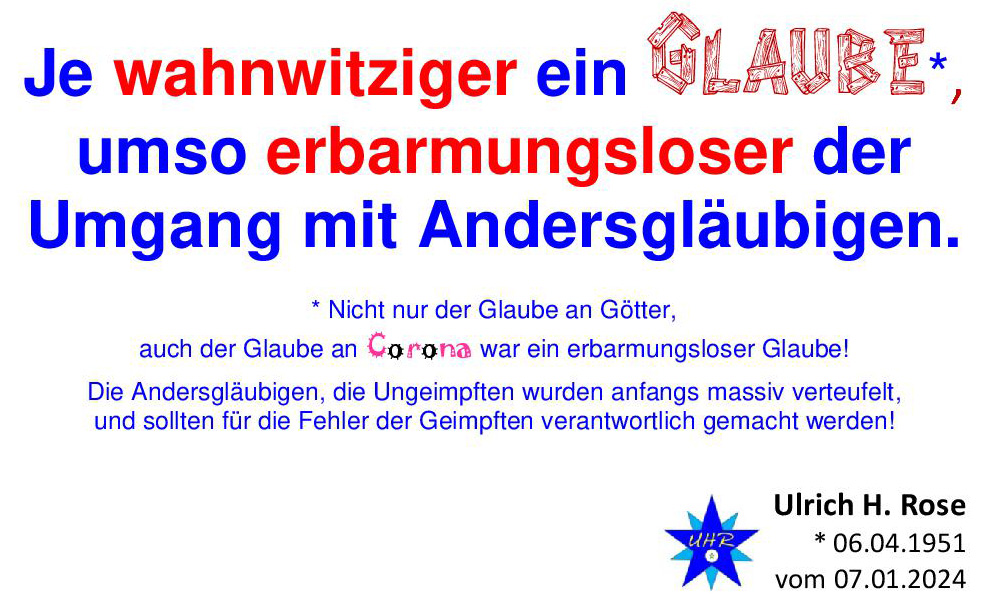 Je wahnwitziger ein Glaube*, umso erbarmungsloser der Umgang mit Andersgläubigen. * Nicht nur der Glaube an Götter, auch der Glaube an Corona war ein erbarmungsloser Glaube! Die Andersgläubigen, die Ungeimpften wurden anfangs massiv verteufelt, und sollten für die Fehler der Geimpften verantwortlich gemacht werden! Ulrich H. Rose vom 07.01.2024