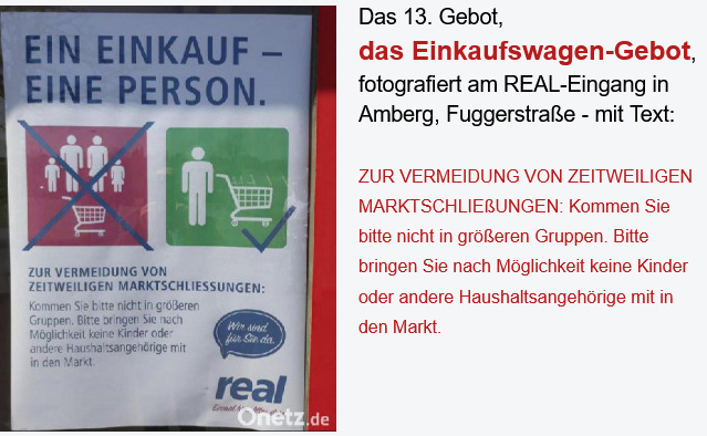 Ab den letzten Tagen des Coronawahnsinns kommt nun das 13. Gebot, das Einkaufswagen-Gebot hinzu. Siehe selbst: