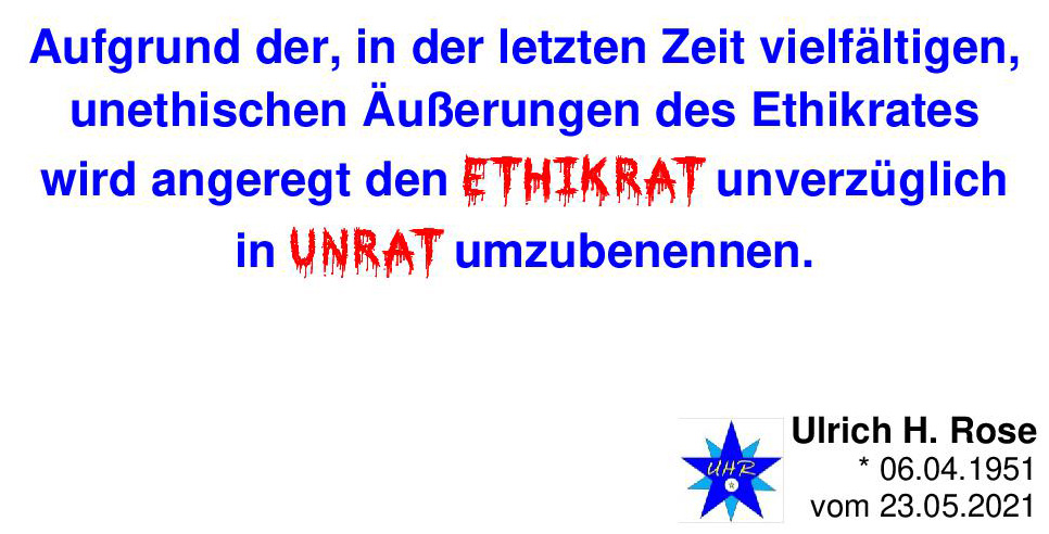 Aufgrund der, in der letzten Zeit vielfältigen, unethischen Äußerungen des Ethikrates wird angeregt den Ethikrat unverzüglich in Unrat umzubenennen. Spruch von Ulrich H. Rose vom 23.05.2021