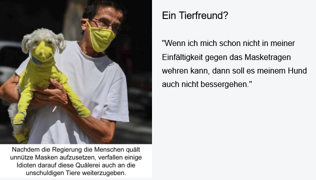 Ein Tierfreud? Wenn ich mich schon nicht wegen meiner Einfältigkeit gegen das Maske tragen wehren kann, dann soll es meinem Hund auch nicht besser gehen.