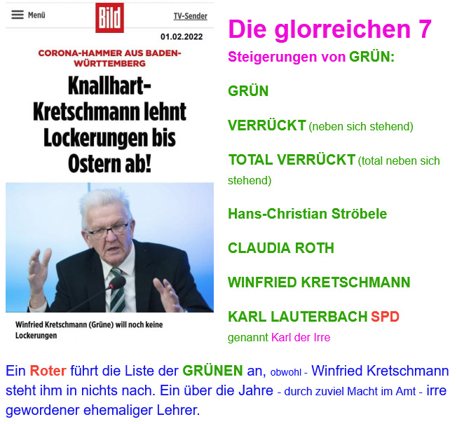 CORONA-HAMMER AUS BADEN-WÜRTTEMBERG: Knallhart-Kretschmann lehnt Lockerungen bis Ostern ab. Die glorreichen 7 Steigerungen von GRÜN: GRÜN, VERRÜCKT (neben sich stehend), TOTAL VERRÜCKT (total neben sich stehend), Hans-Christian Ströbele, CLAUDIA ROTH, WINFRIED KRETSCHMANN, KARL LAUTERBACH SPD genannt Karl der Irre.