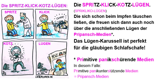 Die SPRITZ-KLICK-KOTZ-LÜGEN. (SPRIKLIKO-LÜGEN). Die sich schon beim Impfen täuschen ließen, die freuen sich dann auch noch über die anschließenden Lügen der Pripansch-Medien*. Das Lügen-Karussell ist perfekt für die gläubigen Schlafschafe! * Primitive panikschürende Medien. In diesem Falle: Primitive panikunterstützende Medien = Pripansch-Medien