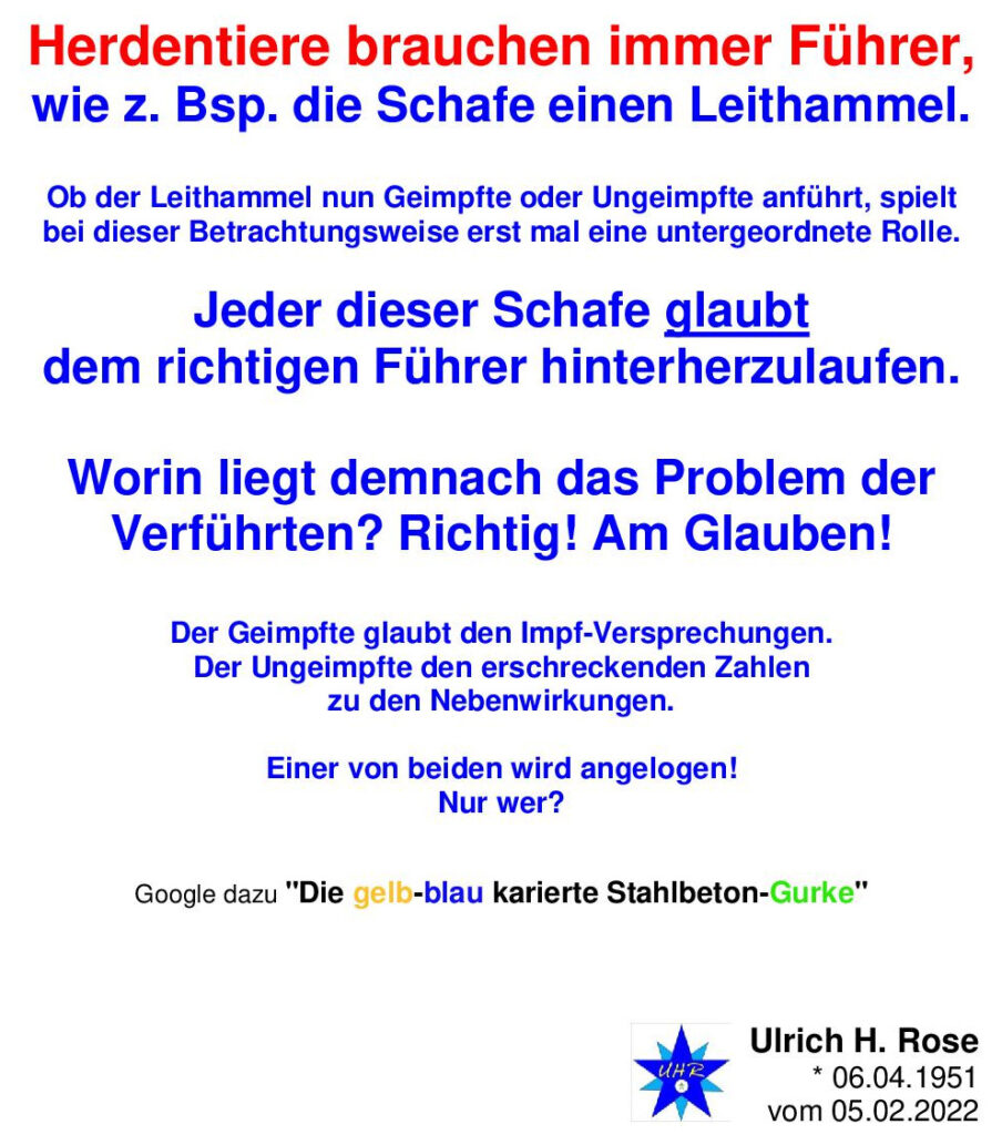 Herdentiere brauchen immer Führer, wie z. Bsp. die Schafe einen Leithammel. Ob der Leithammel nun Geimpfte oder Ungeimpfte anführt, spielt bei dieser Betrachtungsweise erst mal eine untergeordnete Rolle. Jeder dieser Schafe glaubt dem richtigen Führer hinterherzulaufen. Worin liegt demnach das Problem der Verführten? Richtig! Am Glauben! Der Geimpfte glaubt den Impf-Versprechungen. Der Ungeimpfte den erschreckenden Zahlen zu den Nebenwirkungen. Einer von beiden wird angelogen! Nur wer? Google dazu „Die gelb-blau karierte Stahlbeton-Gurke“ Ulrich H. Rose vom 05.02.2022