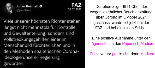Julian Reichelt FAZ 08 Feb 2022 Viele unserer höchsten Richter stehen längst nicht mehr stolz für Kontrolle und Gewaltenteilung, sondern sind Vollstreckungsgehilfen einer im Menschnebild fürchterlichen und in den Methoden spalterischen Corona-Ideologie unserer Regierung geworden.