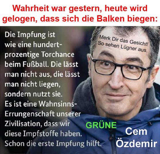 Wahrheit war gestern, heute wird gelogen dass sich die Balken biegen. Die Impfung ist wie eine hundertprozentige Torchance beim Fußball. Die lässt man nicht aus, die lässt man nicht liegen, sondern nutzt sie. Es ist eine Wahnsinnserrungenschaft unserer Zivilisation, dass wir diese Impfstoffe haben. Schon die erste Impfung hilft. GRÜNE. Cem Özdemir. Merk Dir das Gesicht! So sehen Lügner aus.