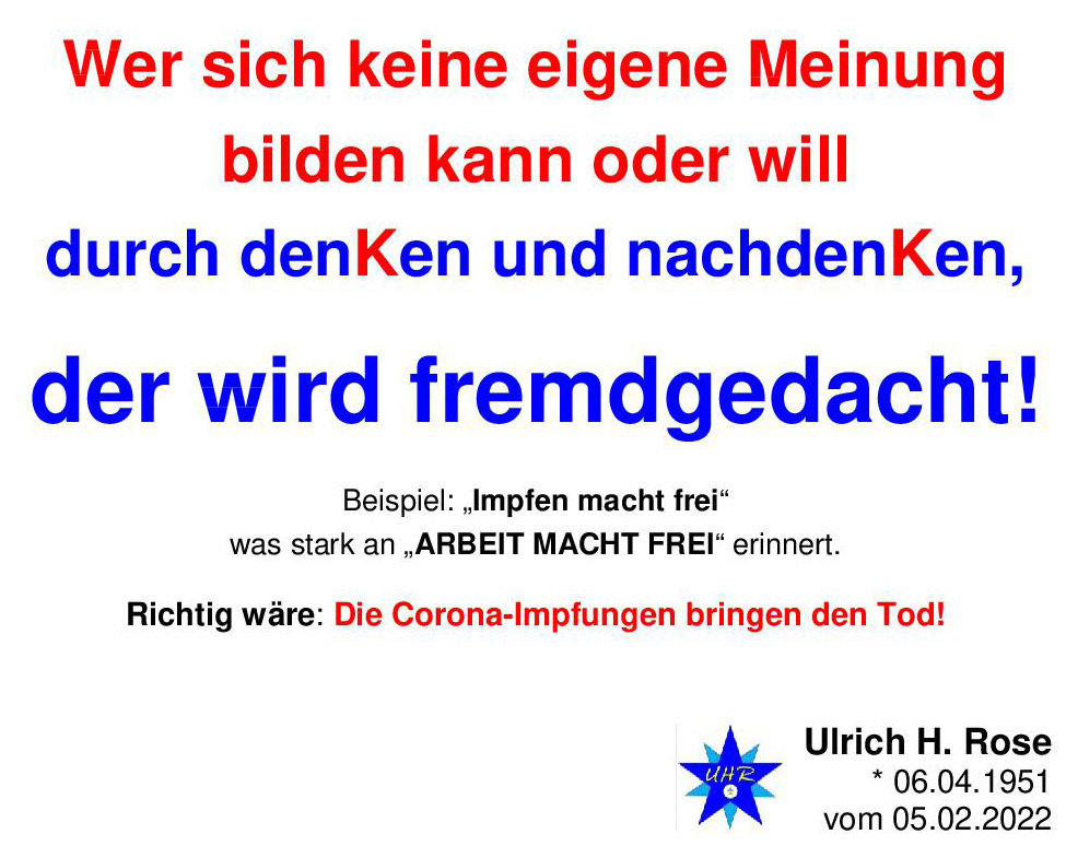 Wer sich keine eigene Meinung bilden kann oder will durch denKen und nachdenKen, der wird fremdgedacht! Ulrich H. Rose vom 06.02.2022