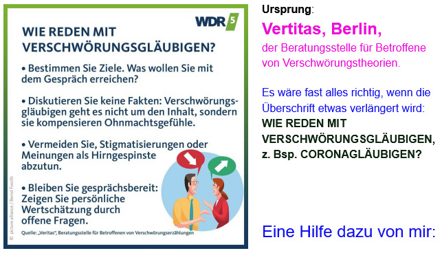 Wie reden mit Verschwörungsgläubigen? WDR. Ursprung Veritas Berlin, der Beratugsstelle für Betroffenen von Verschwörungstheorien. Es wäre fast richtig, wenn die Überschrift etwas verlängert wird. WIE REDEN MIT VERSCHWÖRUNGSGLÄUBIGEN, z. Bsp. CORONAGLÄUBIGEN?