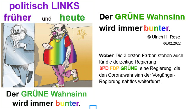 politisch LINKS früher und heute. Der GRÜNE Wahnsinn wird immer bunter. Ulrich H. Rose 06.02.2022. Wobei: Die 3 ersten Farben stehen auch für die derzeitige Regierung SPD FDP GRÜNE, eine Regierung, die den Coronawahnsinn der Vorgänger-Regierung nahtlos weiterführt.