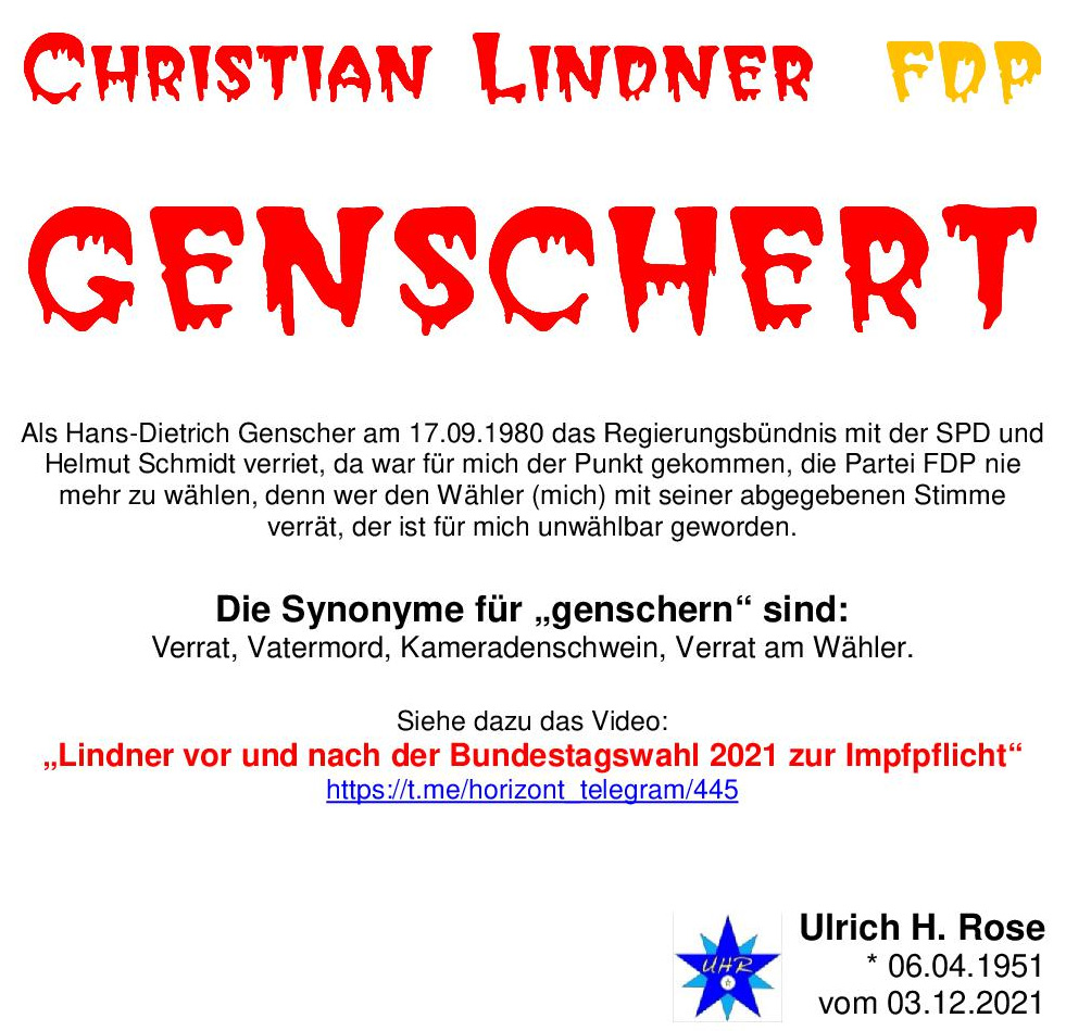 Christian Lindner FDP genschert. Als Hans-Dietrich Genscher am 17.09.1980 das Regierungsbündnis mit der SPD und Helmut Schmidt verriet, da war für mich der Punkt gekommen, die Partei FDP nie mehr zu wählen, denn wer den Wähler (mich) mit seiner abgegebenen Stimme verrät, der ist für mich unwählbar geworden. Die Synonyme für „genschern“ sind: Verrat, Vatermord, Kameradenschwein, Verrat am Wähler. Siehe dazu das Video: „Lindner vor und nach der Bundestagswahl 2021 zur Impfpflicht“ Ulrich H. Rose vom 03.12.2021