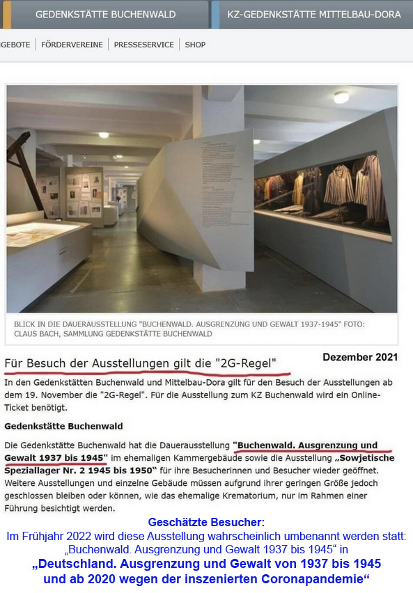 Geschätzte Besucher: Im Frühjahr 2022 wird diese Ausstellung umbenannt werden statt: „Buchenwald. Ausgrenzung und Gewalt 1937 bis 1945“ in „Deutschland. Ausgrenzung und Gewalt 1937 bis 1945 und ab 2020 wegen der inszenierten Coronapandemie“