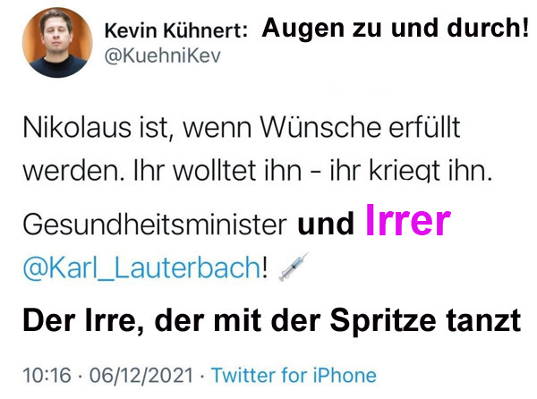 Kevin Kühnert: Augen zu und durch! Nikolaus ist, wenn Wünsche erfüllt werden. Ihr wollt ihn – ihr kriegt ihn. Gesundheitsminister und Irrer Karl Lauterbach. Der Irre, der mit der Spritze tanzt. 06.12.2021