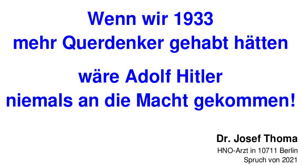 Wenn wir 1933 mehr Querdenker gehabt hätten wäre Adolf Hitler niemals an die Macht gekommen! Dr. Josef Thoma, HNO-Arzt in Berlin