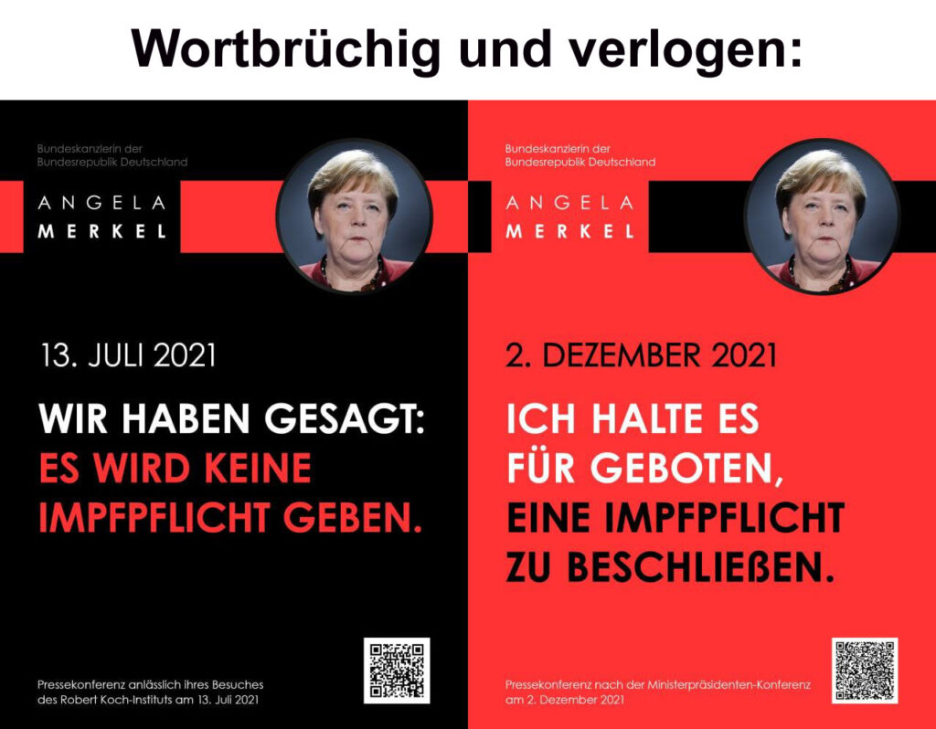 Angela Merkel am 13. Juli 2021: Wir haben gesagt: Es wird keine Impfpflicht geben. Angela Merkel am 02. Dez. 2021: Ich halte es für geboten, eine Impfpflicht zu beschließen.