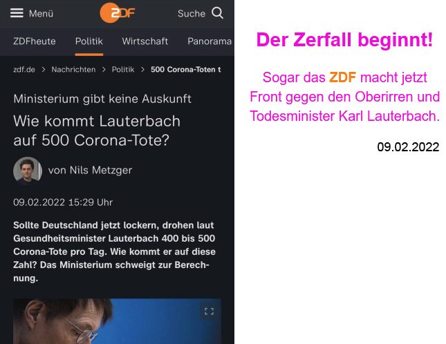 Der Zerfall beginnt! Sogar das ZDF macht jetzt Front gegen den Oberirren und Todesminister Karl Lauterbach. 09.02.2022. Wie kommt Lauterbach auf 500 Corona-Tote pro Tag? Das Ministerium schweigt zur Berechnung.