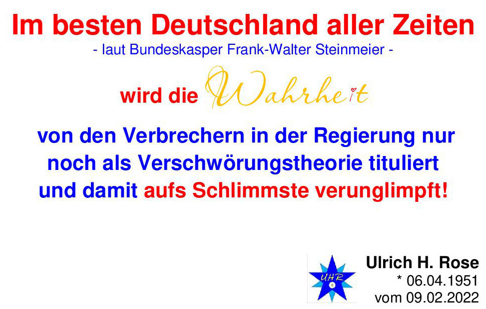 Im besten Deutschland aller Zeiten – laut Bundeskasper Frank-Walter Steinmeier – wird die Wahrheit von den Verbrechern in der Regierung nur noch als Verschwörungstheorie tituliert und damit aufs Schlimmste verunglimpft! Ulrich H. Rose vom 09.02.2022