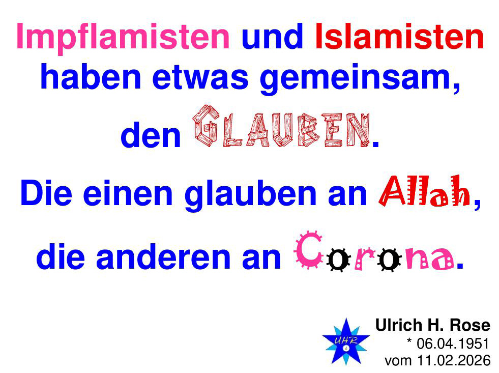 Impflamisten und Islamisten haben etwas gemeinsam den Glauben. Die einen glauben an Allah, die anderen an Corona. Ulrich H. Rose vom 11.02.2026