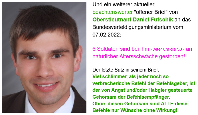 Und ein weiterer aktueller beachtenswerter „offener Brief“ von Oberstleutnant Daniel Futschik an das Bundesverteidigungsministerium vom 07.02.2022: 6 Soldaten sind bei ihm – Alter um die 30 – an natürlicher Altersschwäche gestorben! Der letzte Satz in seinem Brief: Viel schlimmer, als jeder noch so verbrecherische Befehl der Befehlsgeber, ist der von Angst und/oder Habgier gesteuerte Gehorsam der Befehlsempfänger. Ohne diesen Gehorsam sind ALLE diese Befehle nur Wünsche ohne Wirkung!