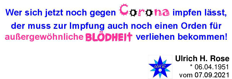 Wer sich jetzt noch gegen Corona impfen lässt, der muss zur Impfung auch noch einen Orden für außergewöhnliche Blödheit verliehen bekommen! Ulrich H. Rose vom 07.09.2021