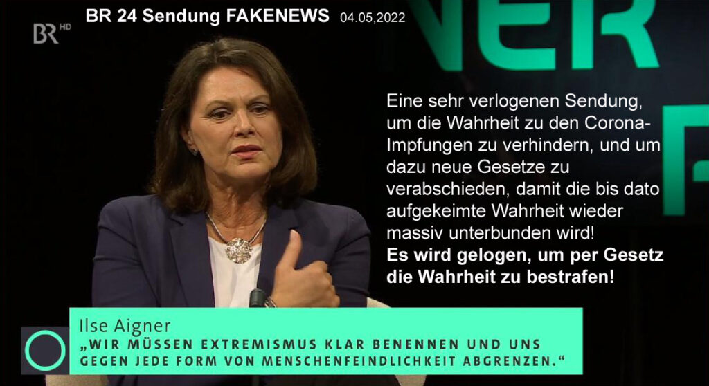 BR 24 Sendung FAKENEWS 04.05.2022. Eine sehr verlogene Sendung, um die Wahrheit zu den Corona-Impfungen zu verhindern, und um neue Gesetze zu verabschieden, damit die dato aufkeimende Wahrheit wieder massiv unterbunden wird! Es wir gelogen, um per Gesetz die Wahrheit zu bestrafen! Ilse Aigner: „Wir müssen Extremismus klar benennen und uns gegen jede Form von Menschenfeindlichkeit abgrenzen.