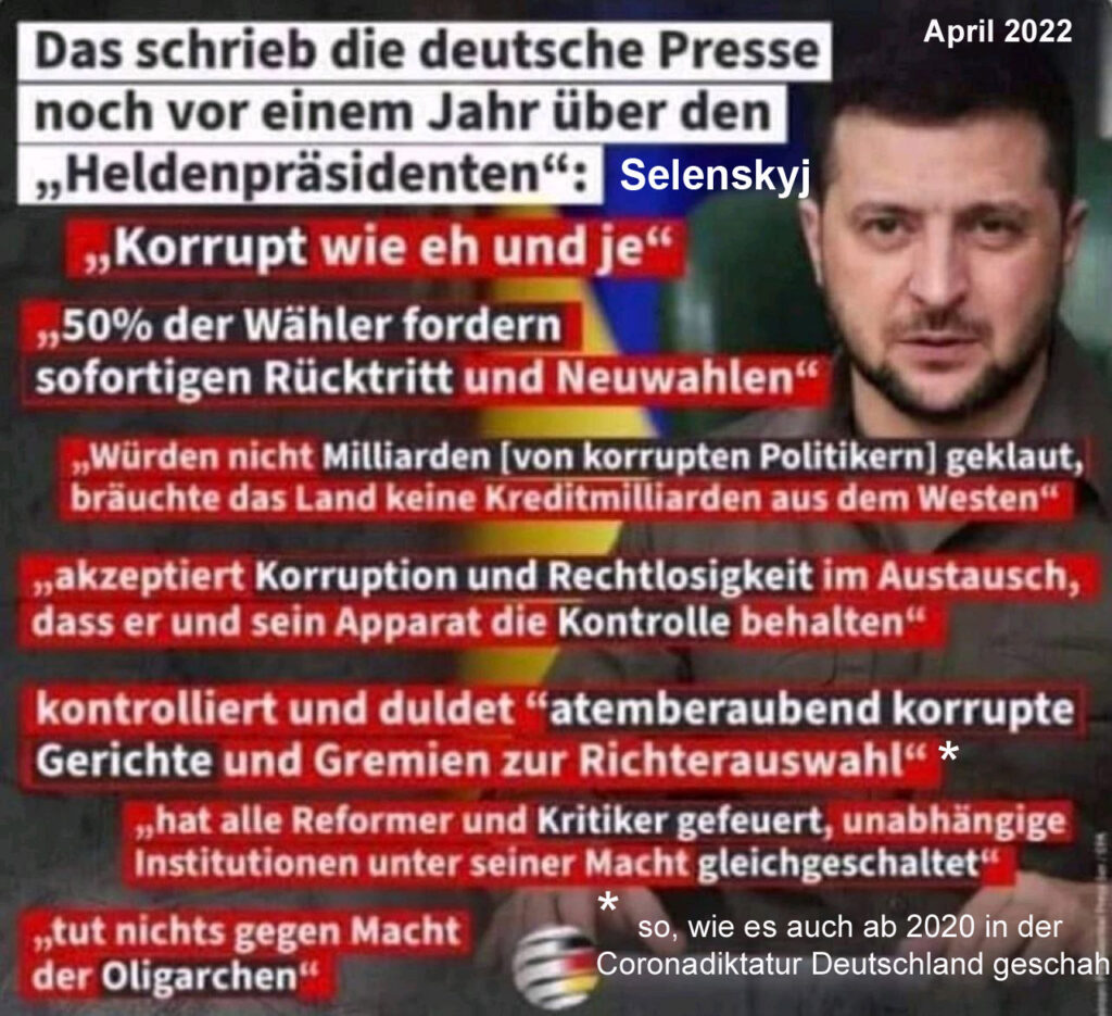Das schrieb die deutsche Presse noch vor einem Jahr über den Heldenpräsidenten Selenskyj: „Korrupt wie eh und je“, „50% der Wähler fordern sofortigen Rücktritt und Neuwahlen“, „Würden nicht Milliarden (von korrupten Politikern) geklaut, bräuchte das Land keine Kreditmilliarden aus dem Westen“, „akzeptiert Korruption und Rechtlosigkeit als Austausch, dass er und sein Apparat die Kontrolle behalten“, kontrolliert und duldet „atemberaubende korrupte Gerichte und Gremien zu Richterwahl“. * “ hat alle Reformer und Kritiker gefeuert, unabhängige Institutionen unter seiner Macht gleichgeschaltet“, „tut nichts gegen die Macht der Oligarchen“ * so, wie es auch ab 2020 in der Coronadiktatur geschah.
