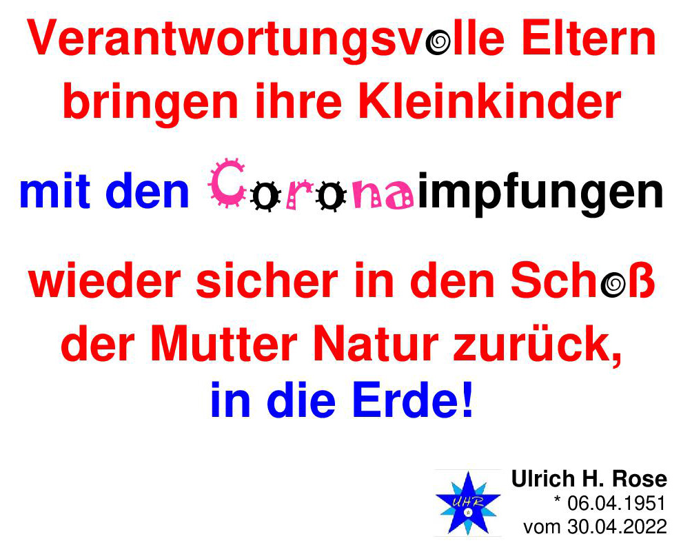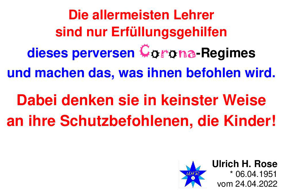 Wer sich nicht wehrt ist gestört. Spruch von Ulrich H. Rose vom 04.05.2022. Dreh Dich nur einmal im Kreise rum! Was siehst Du? Meistens Gestörte! Und Du selbst? Das sind die Auswirkungen der inszenierten Coronatyrannei der Geldmächtigen der Welt; ausgeführt durch gut bestochene Politiker, Virologen, Medienleute, Ärzte, Richter, etc. – und in erster Linie, in erster Front erarbeitet durch Top-Psychologen!