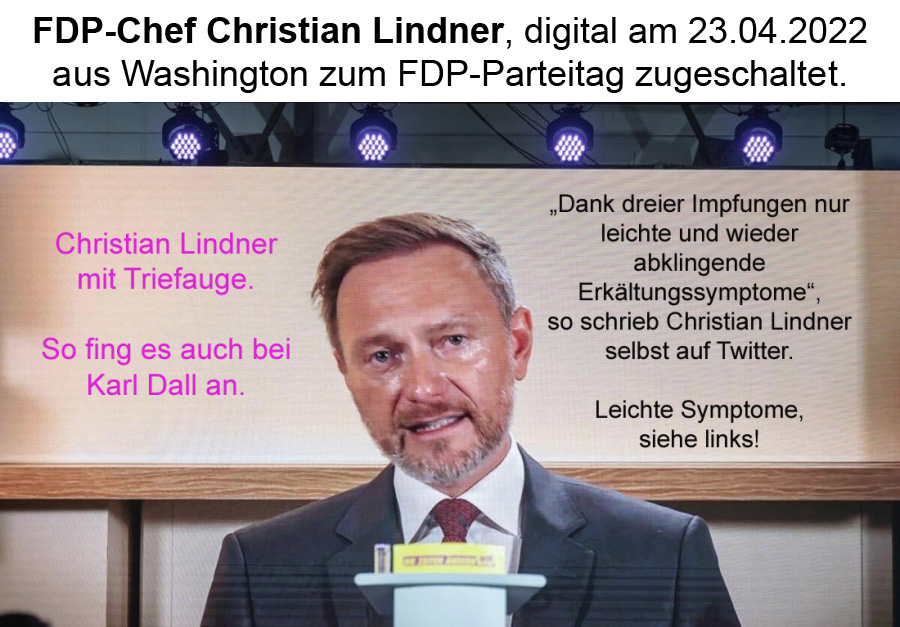 FDP-Chef Christian Lindner, digital am 23.04.2022 aus Washington zum FDP-Parteitag zugeschaltet. Christian Lindner mit Triefauge. So fing es auch bei Karl Dall an. „Dank dreier Impfungen nur leichte und wieder abklingende Erkältungssymptome“, so schrieb Christian Lindner selbst auf Twitter. Leichte Symptome. Siehe links!