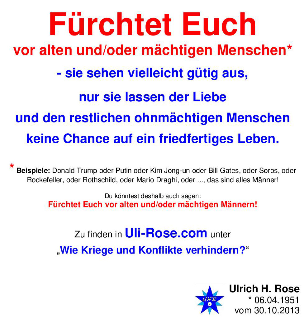 Fürchtet Euch vor alten und/oder mächtigen Menschen – sie sehen vielleicht gütig aus, nur sie lassen der Liebe und den restlichen ohnmächtigen Menschen keine Chance auf ein friedfertiges Leben. * Beispiele: Donald Trump oder Putin oder Kim Jong-un oder Bill Gates, oder Soros, oder Rockefeller, oder Rothschild, oder Mario Draghi, oder …, das sind alles Männer! Du könntest deshalb auch sagen: Fürchtet Euch vor alten und/oder mächtigen Männern! Zu finden in Uli-Rose.com unter „Wie Kriege und Konflikte verhindern?“ Ulrich H. Rose vom 30.10.2013