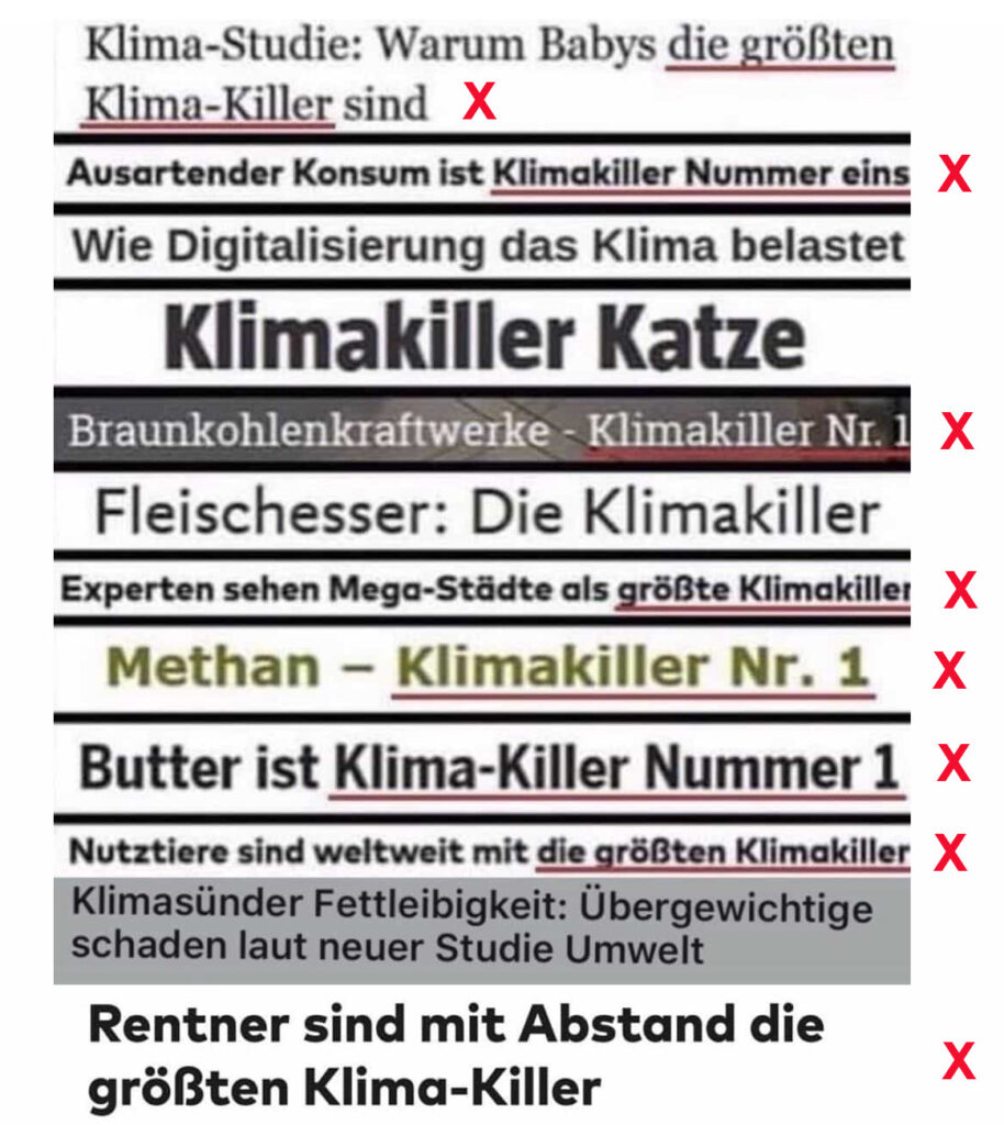 Mal sind es die Babys, dann der Konsum, dann die Braunkohlenwerke, dann die Megastädte, dann das Methan, dann die Butter, dann die Nutztiere, dann die Rentner. So gut recherchieren unsere  Medien, unser Verstandskiller Nr. 1