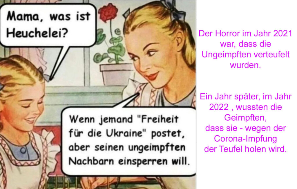 Mama, was ist Heuchelei? Wenn jemand „Freiheit für die Ukraine“ postet, aber seinen ungeimpften Nachbarn einsperren will.