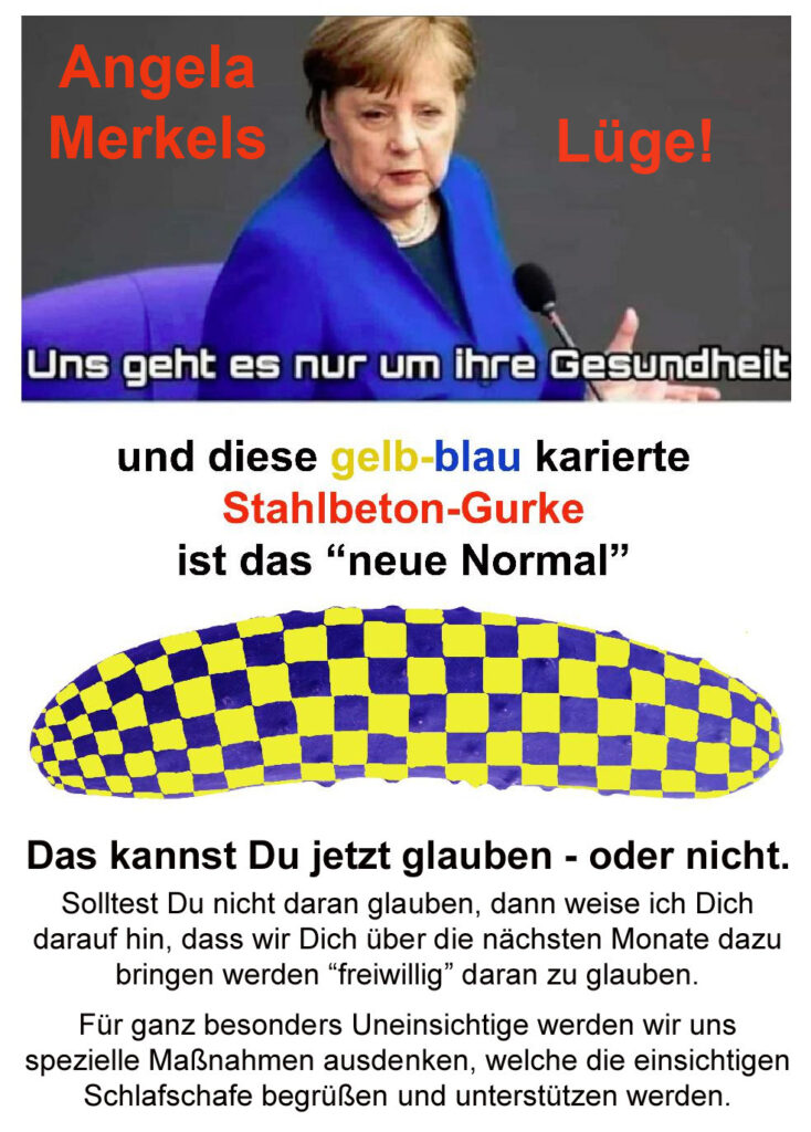 Angela Merkels Lüge! Uns geht es nur um ihre Gesundheit und diese gelb-blau karierte Stahlbetongurke ist das „neue Normal“ Das kannst Du jetzt glauben – oder nicht. Solltest Du nicht daran glauben, dann wiese ich Dich darauf hin, dass wir Dich über die nächsten Monate dazu bringen werden „freiwillig“ daran zu glauben. Für ganz besonders Uneinsichtige werden wir uns spezielle Maßnahmen ausdenken, welche die einsichtigen Schlafschafe begrüßen und unterstützen werden.