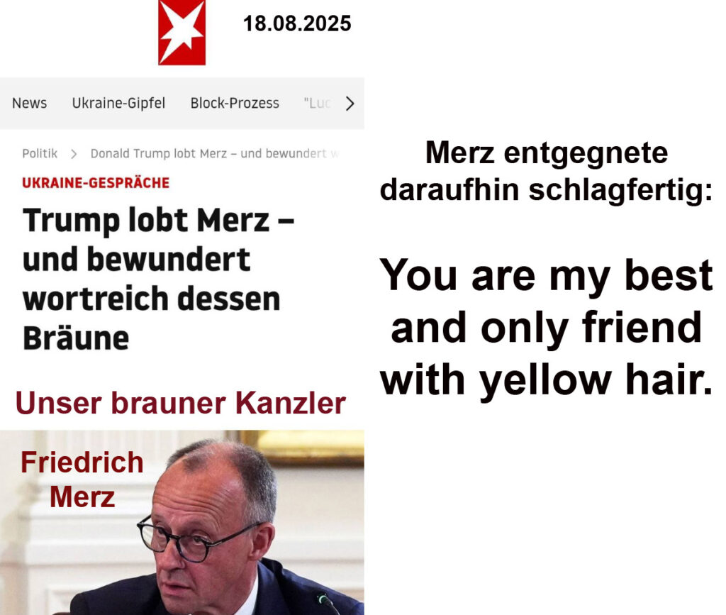 Trump lobt Merz und bewundert wortreich dessen Bräune. Unser brauner Kanzler Friedrich Merz. 18.08.2025. Merz entgegnete schlagfertig: You are my best and only friend with yellow hair.