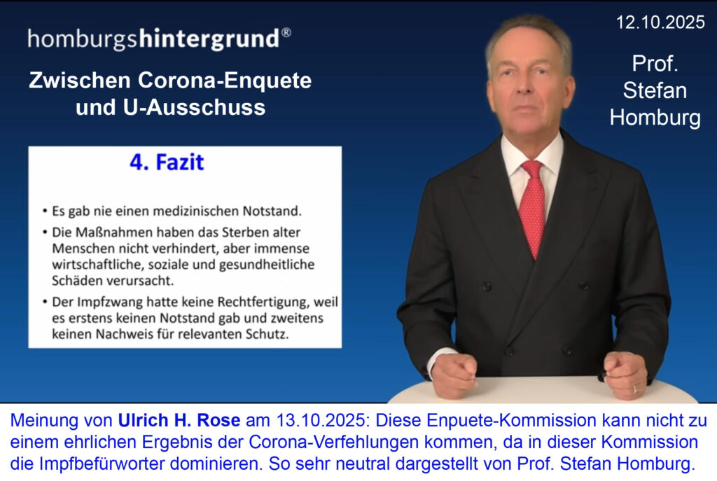 Meinung von Ulrich H. Rose am 13.10.2025: Diese Enquete-Kommission kann nicht zu einem ehrliche Ergebnis der Corona-Verfehlungen kommen, da in dieser Kommission die Impfbefürworter dominieren. So sehr neutral dargestellt von Prof. Stefan Homburg.