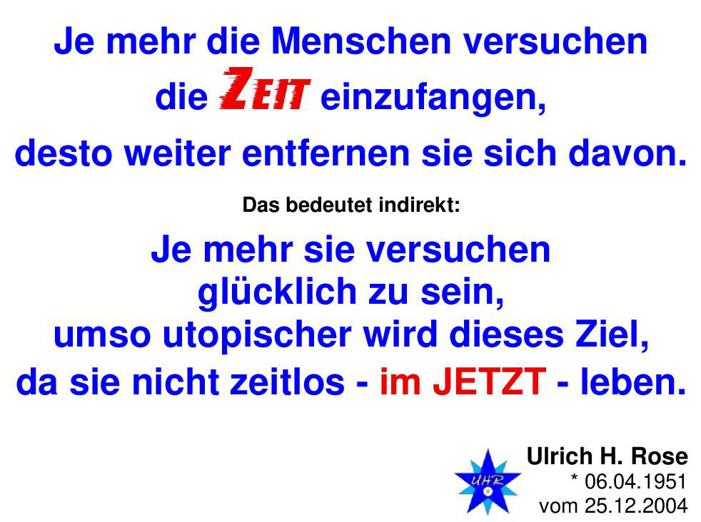 Je mehr die Menschen versuchen die Zeit einzufangen, desto weiter entfernen sie sich davon. Das bedeutet indirekt: Je mehr sie versuchen glücklich zu sein, umso utopischer wird dieses Ziel, da sie nicht zeitlos – im JETZT – leben. Ulrich H. Rose vom 25.12.2004