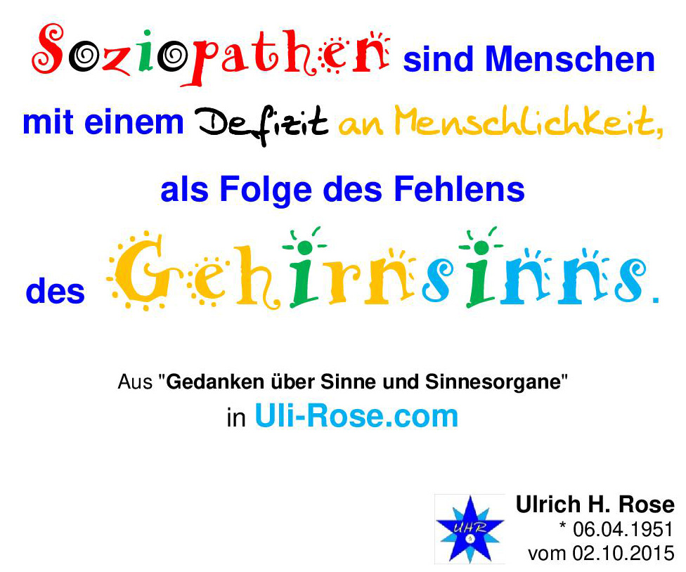 Die Soziopathen sind Menschen mit einem Defizit an Menschlichkeit, als Folge des Fehlens des Gehirnsinns. Ulrich H. Rose vom 02.10.2015