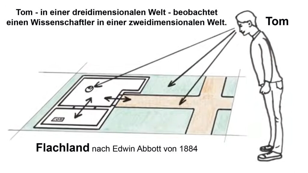 Tom – in einer zweidimensionalen Welt – beobachtet einen Wissenschaftler in einer zweidimensionalen Welt. Flachland nach Edwin Abbott von 1884