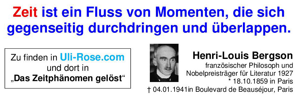 Ergänzung am 07.01.2025: Heute entdeckte ich, dass sich im Jahr 1922 in Paris Albert Einstein und Henri-Louis Bergson trafen und über die Zeit diskutierten. Dabei vertrat u. a. Henry Bergson folgende Meinung: „Zeit ist ein Fluss von Momenten, die sich gegenseitig durchdringen und überlappen„.