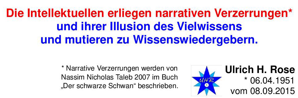 Wenn Du jetzt auch noch den „Blinden Fleck beim Denken“ zu den „Narrativen Verzerrungen“ hinzudenkst, dann wirst Du evtl. erst jetzt, 5 Jahre nach der Veröffentlichung des „Blinden Fleck beim Denken“ (vom 20.08.2010) verstehen, dass die Problematik der „Narrativen Verzerrung“ am Extremsten bei den Intellektuellen auftreten muss, denn sie erliegen ihrer Illusion des Vielwissens.