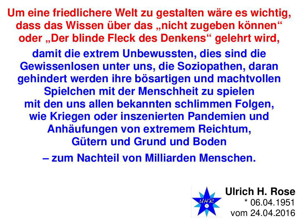 Ich spreche die intellektuellen Menschen an – denn gerade diese intellektuellen Menschen, die führenden Persönlichkeiten in unserer Gesellschaft, die haben dieses Kardinalproblem des „blinden Flecks beim Denken“ in sehr stark ausgeprägtem Maße unbewusst in sich!