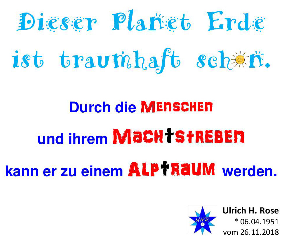 Dieser Planet Erde ist traumhaft schön. Durch die Menschen und ihrem Machtstreben kann er zu einem Alptraum werden. Spruch von Ulrich H. Rose vom 26.11.2018