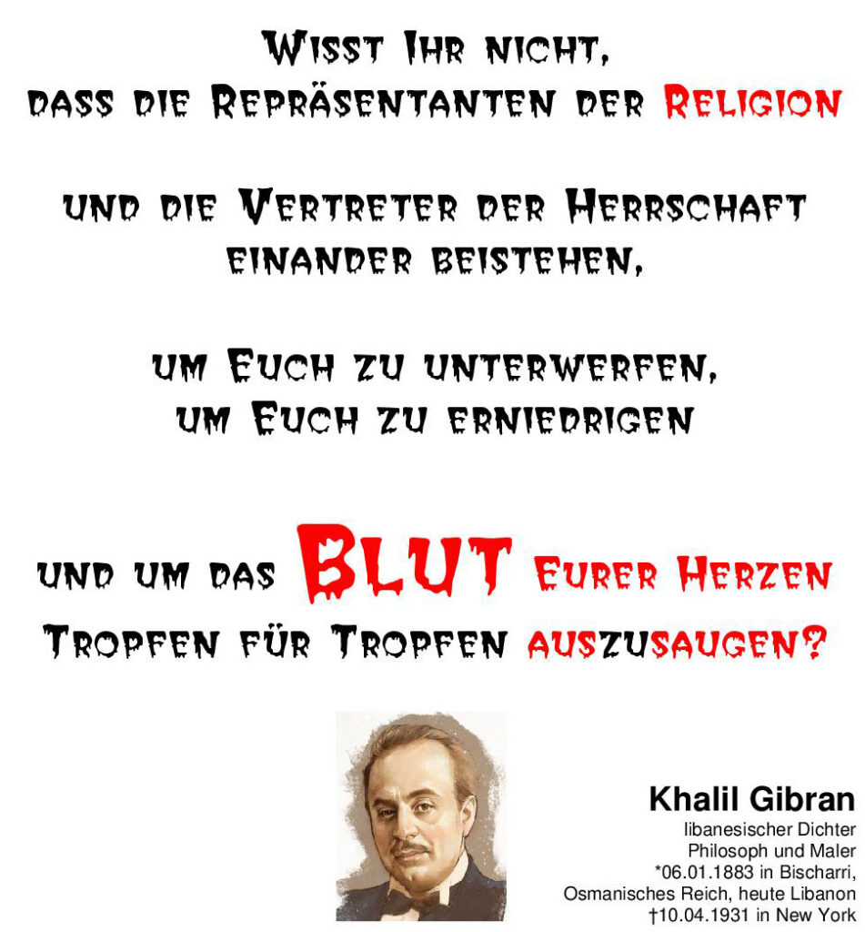 Wisst Ihr nicht, dass die Repräsentanten der Religion und die Vertreter der Herrschaft einander beistehen, um Euch zu unterwerfen, um Euch zu erniedrigen und um das Blut Eurer Herzen Tropfen für Tropfen auszusaugen? Spruch von Khalil Gibran