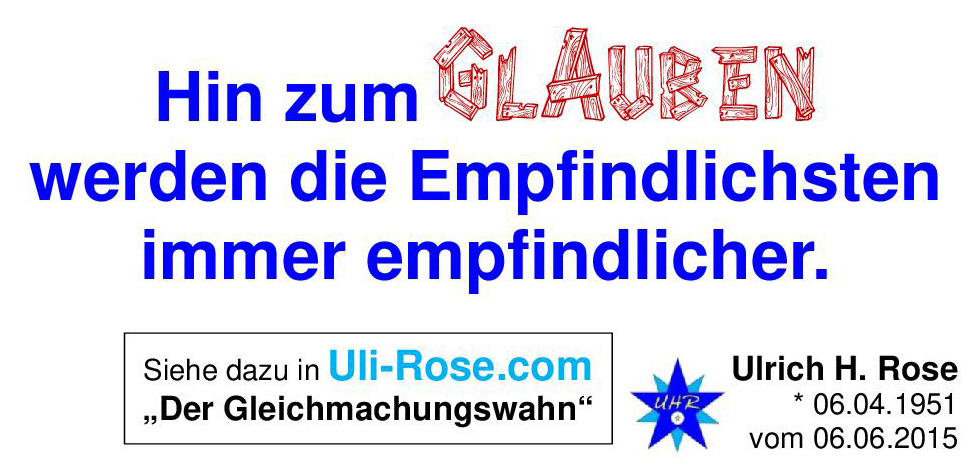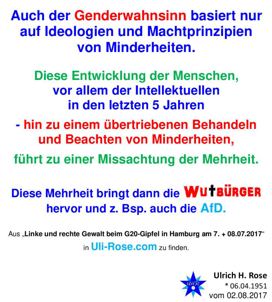 Auch der Genderwahnsinn basiert nur auf Ideologien und Machtprinzipien von Minderheiten. Diese Entwicklung der Menschen, vor allem der Intellektuellen, in den letzten 5 Jahren – hin zu einem übertriebenen Behandeln und Beachten von Minderheiten, führt zu einer Missachtung der Mehrheit. Diese Mehrheit bringt dann die Wutbürger hervor und z. Bsp. auch die AfD. Spruch von Ulrich H. Rose vom 02.08.2017. Aus „Linke und rechte Gewalt beim G20-Gipfel in Hamburg am 7. + 08.07.2017“ in Uli-Rose.com
