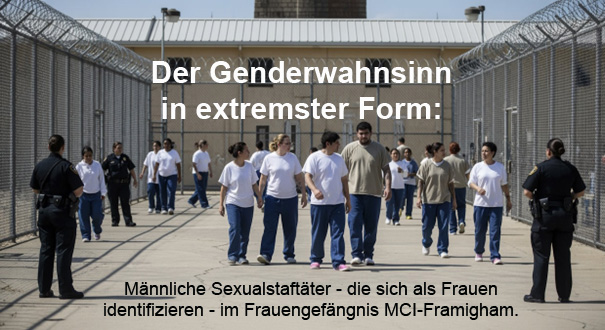 Siehe dazu bis zum Schluss, was für sehr unangenehme Nebenwirkungen der Genderwahnsinn nach sich zog: Im Frauengefängnis MCI-Framingham in Massachusetts, dürfen männliche Sexualstraftäter, die sich als „Frau“ identifizieren unter den Frauen leben und diese offensichtlich auch vergewaltigen. Wer es wagt, das Problem beim Namen zu nennen, wird bestraft – nicht die Täter.