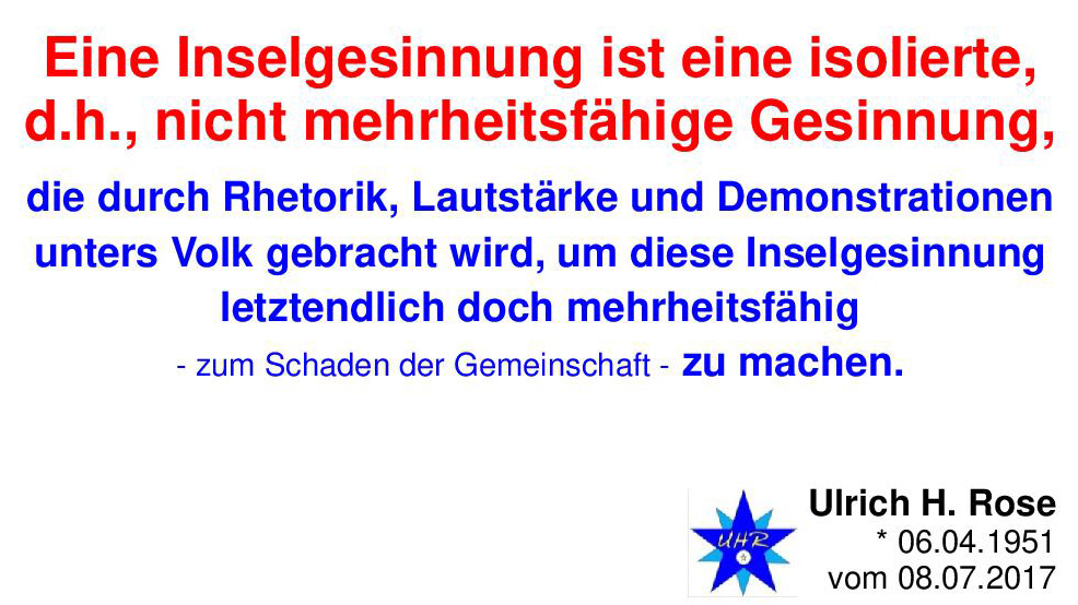 Eine Inselgesinnung ist eine isolierte, d.h., nicht mehrheitsfähige Gesinnung, die durch Rhetorik und Lautstärke und Demonstrationen unters Volk gebracht wird, um diese Inselgesinnung letztendlich doch mehrheitsfähig – zum Schaden der Gemeinschaft – zu machen. Ulrich H. Rose vom 08.07.2017
