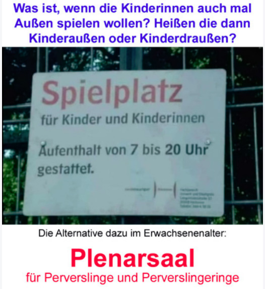 Was ist, wenn die Kinderinnen auch mal außen spielen wollen? Heißen die dann Kinderaußen oder Kinderdraußen? Spielplatz für Kinder und Kinderinnen. Aufenthalt von 7 bis 20 Uhr gestattet. Die Alternative dazu im Erwachsenenalter: Plenarsaal für Perverslinge und Perverslingeringe.