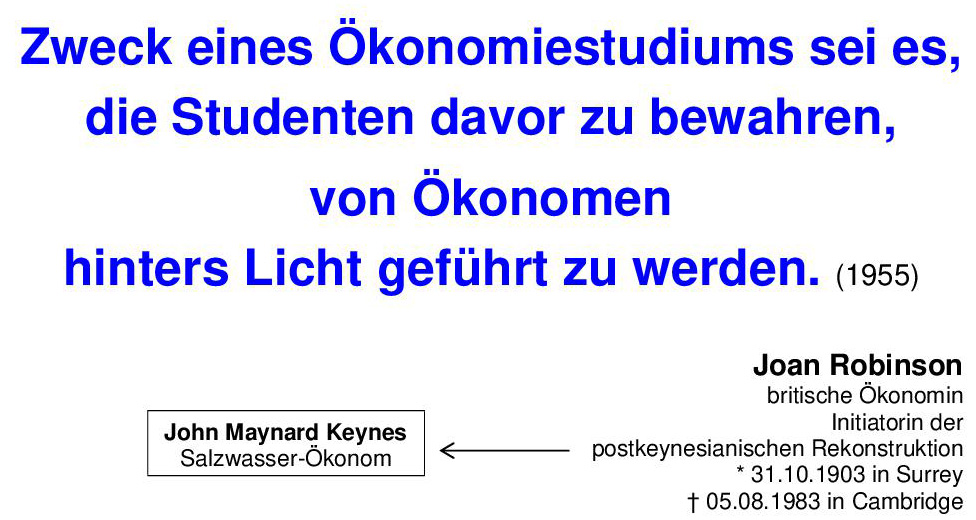 Zweck eines Ökonomiestudiums sei es, die Studenten davor zu bewahren, von Ökonomen hinters Licht geführt zu werden. Spruch von Joan Robinson, britische Ökonomin.