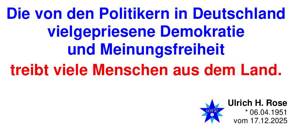 Die von den Politikern in Deutschland vielgepriesene Demokratie und Meinungsfreiheit treibt viele Menschen aus dem Land. Ulrich H. Rose vom 17.12.2025