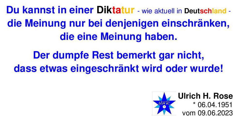 Du kannst in einer Diktatur – wie aktuell in Deutschland – die Meinung nur bei denjenigen einschränken, die eine Meinung haben. Der dumpfe Rest bemerkt gar nicht, dass etwas eingeschränkt wird oder wurde! Ulrich H. Rose vom 09.06.2023