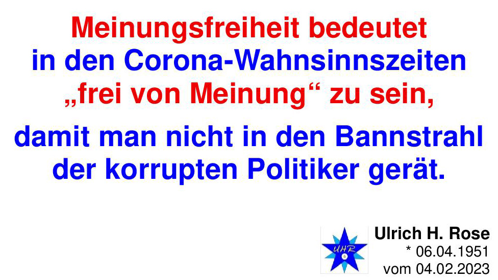 Meinungsfreiheit bedeutet in den Corona-Wahnsinnszeiten „frei von Meinung“ zu sein, damit man nicht in den Bannstrahl der korrupten Politiker gerät. Ulrich H. Rose vom 04.02.2023.