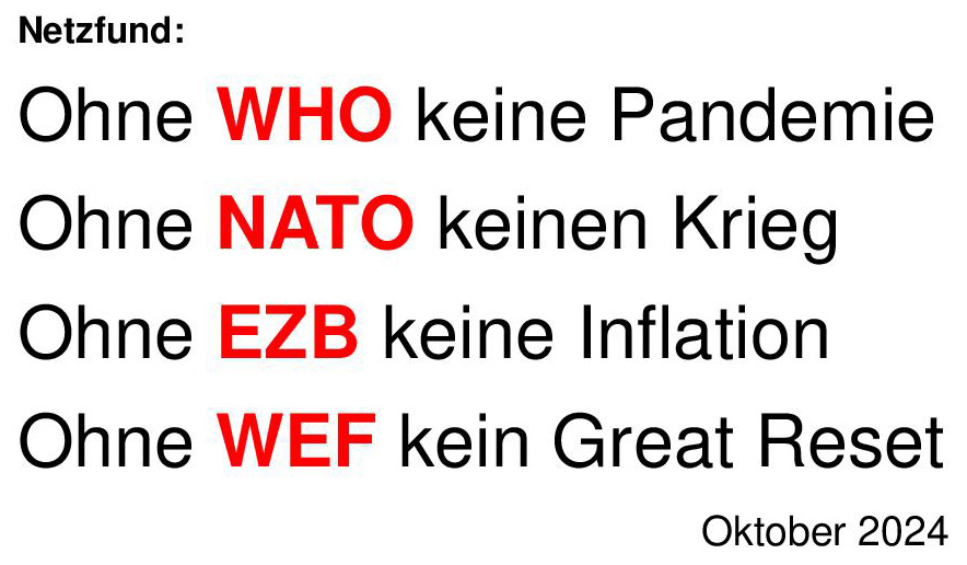 Netzfund: Ohne WHO keine Pandemie. Ohne NATO keinen Krieg. Ohne EZB keine Inflation. Ohne WEF kein Great Reset. Oktober 2024