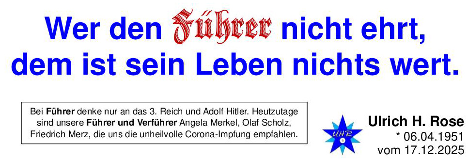 Wer den Führer nicht ehrt, dem ist sein Leben nichts wert. Ulrich H. Rose vom 17.12.2025